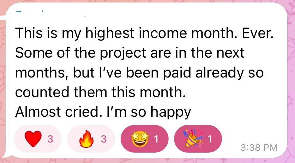 Each week you can plug into Telegram for business coaching or content (etsy, insta, email, Pinterest, website, forms, you name it) feedback.